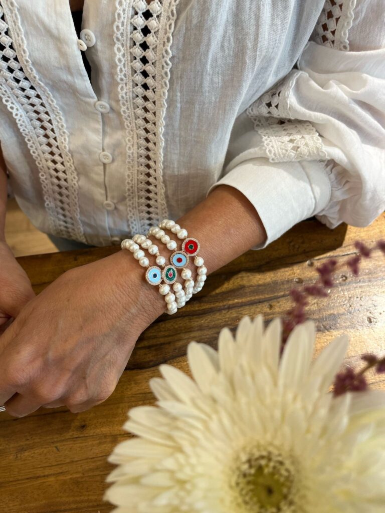 צמיד פנינים אמיתיות מתורבתות עם עם עין אמייל כסף מצופה זהב אדום. אורך מתכוונן וניתן להתאמה לכל יד. נסגר עם חוט רקום ובסופו פנינים.