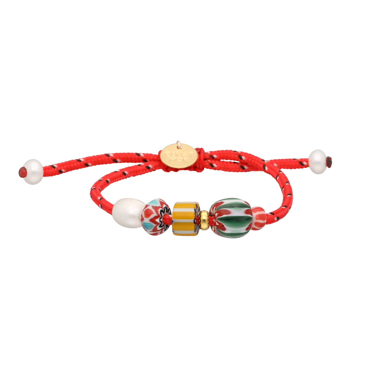 צמיד חוט אדום בשלוב פנינים אמיתיות וחרוזים צבעוניים נסגר עם חוט רקום אורך מתכוונן
