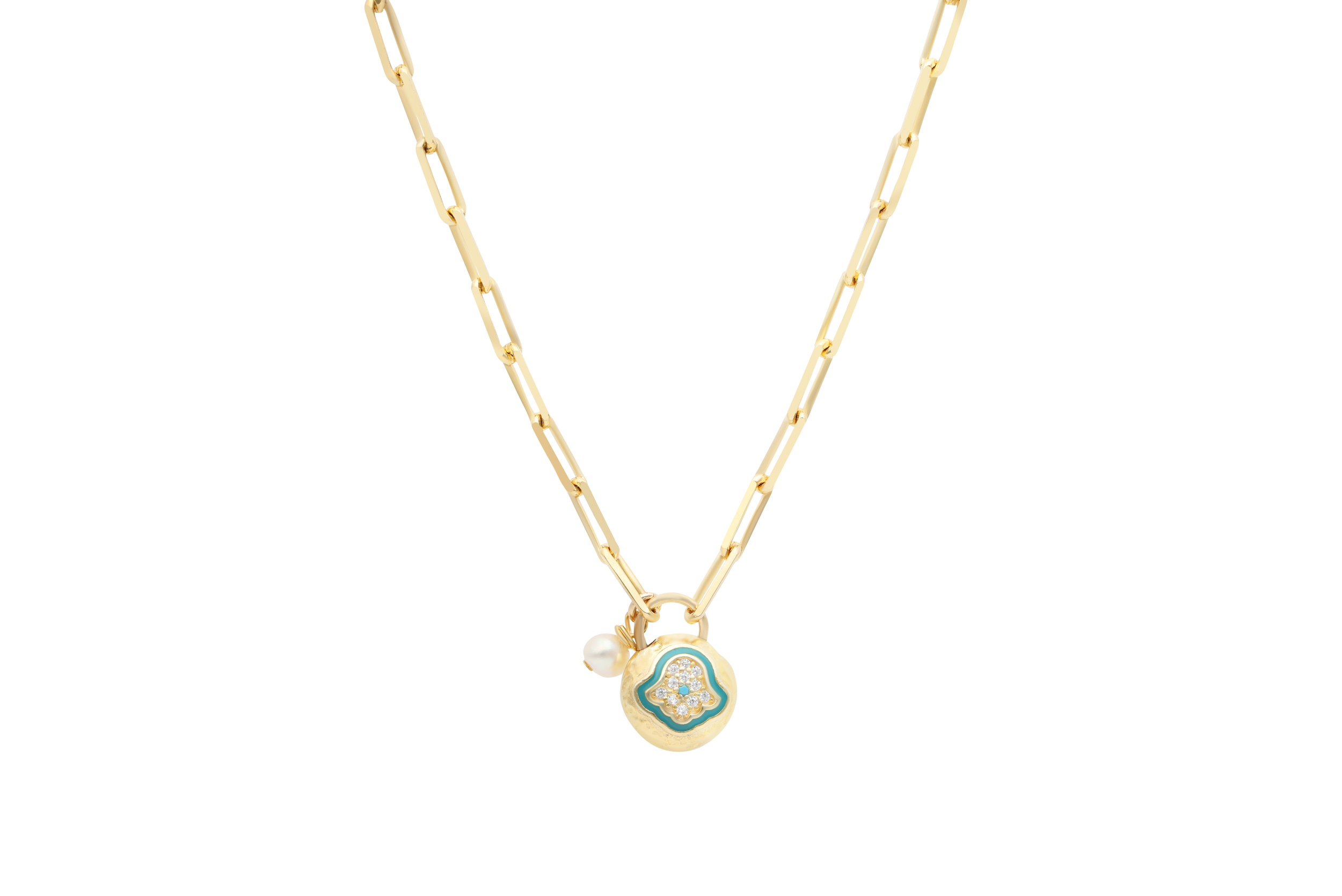 שרשרת גולדפילד עם תליון עגול שבתוכו חמסה דו צדדית עשויה מכסף מצופה זהב בצבעים טורקיז או כחול .עם שיבוץ זירקונים. בצידה פנינה קטנה.אורך השרשרת 40 סמ והארכה