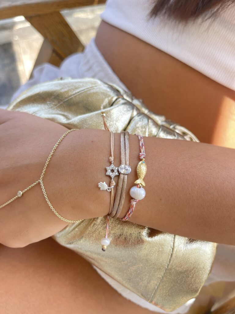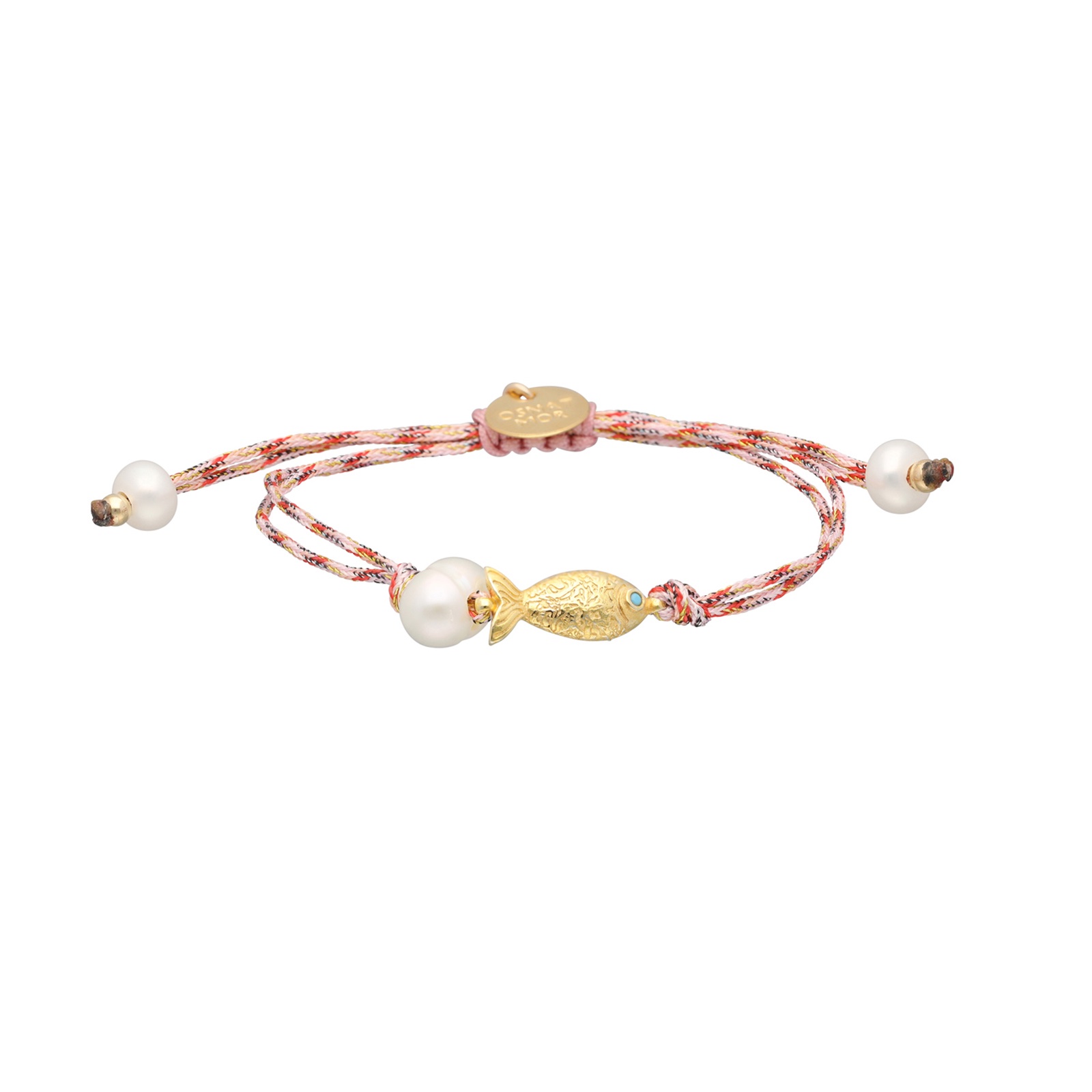 צמיד חוט בגווני ורוד בשילוב דג עשוי מכסף מצופה זהב ופנינים אמיתיות, נסגר עם חוט רקום אורך מתכוונן