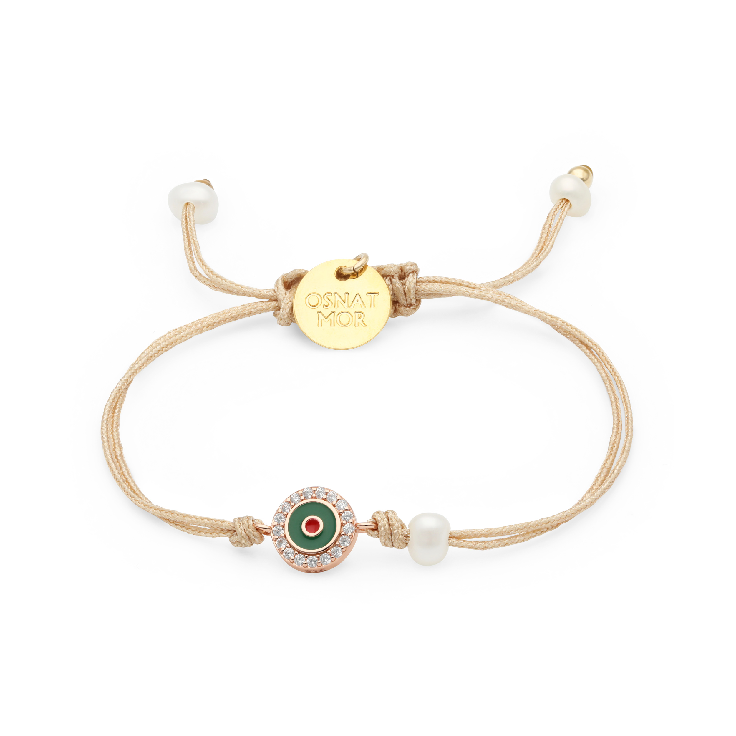 צמיד חוט משי גוון ניוד.עם עין אמאיל עשויה מבסיס כסף מצופה זהב ושיבוץ זירקונים. בצידו פנינה מתורבתת אמיתית. נסגר בקשירת מקרמה שבסופו פנינה וחרוז גולדפילד. אורך מתכוונן. מתאים לכל יד