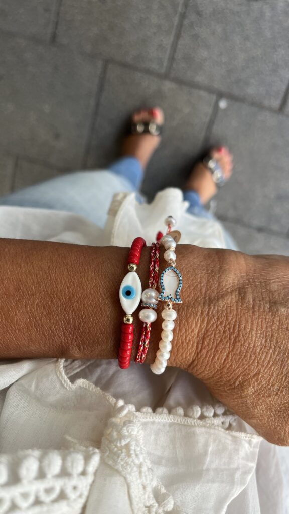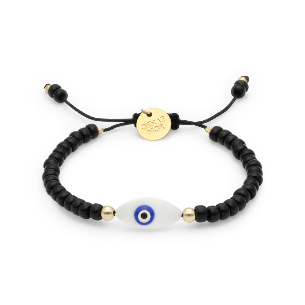 צמיד חרוזים שבמרכזו עין מאורכת ובצדדיה כדורי גולדפילד. נסגר בקשירת מקרמה. אורך מתכוונן. מתאים לכל יד
