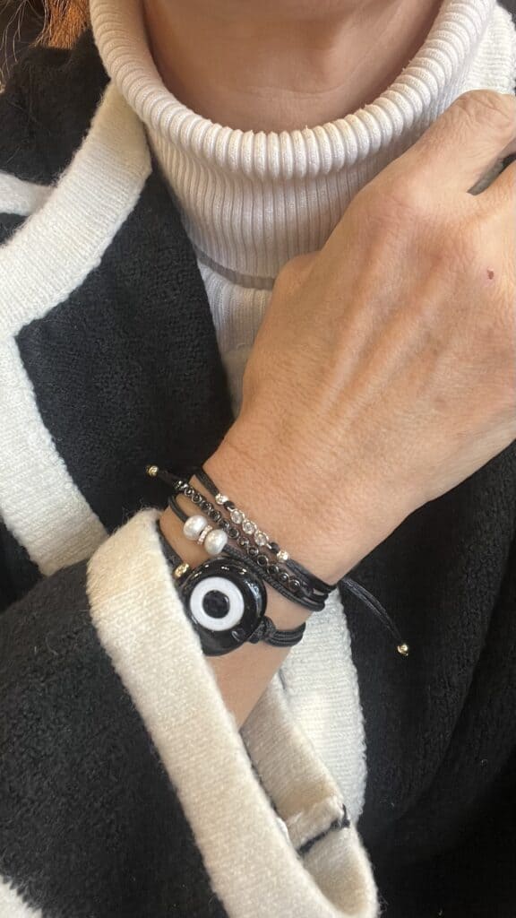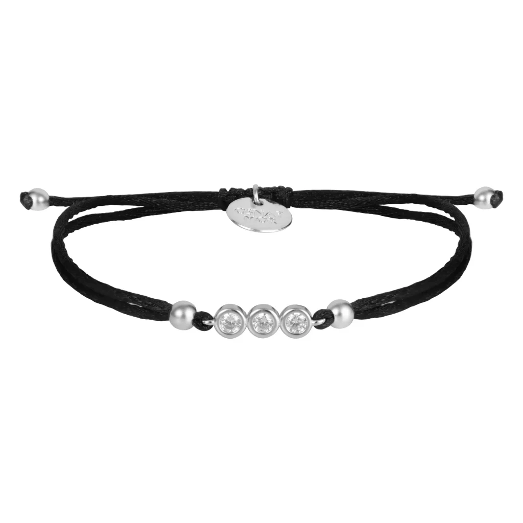 צמיד עם שלושה זירקונים על בסיס כסף טהור. חוט סאטן שחור. נסגר עם חוט רקום שבסופו חרוז כסף אורך מתכוונן .