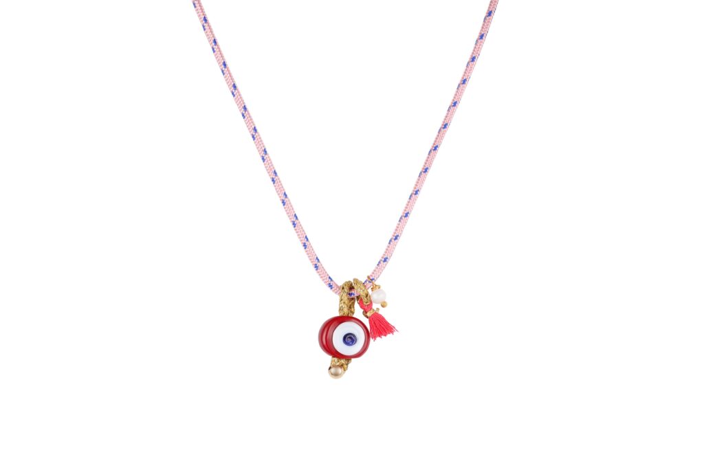 שרשרת עין טובה אדומה סרוגה בחוט זהב, פנינה אמיתית וגדיל אדום על חוט ורוד. אורך השרשרת 40 ס"מ והארכה.