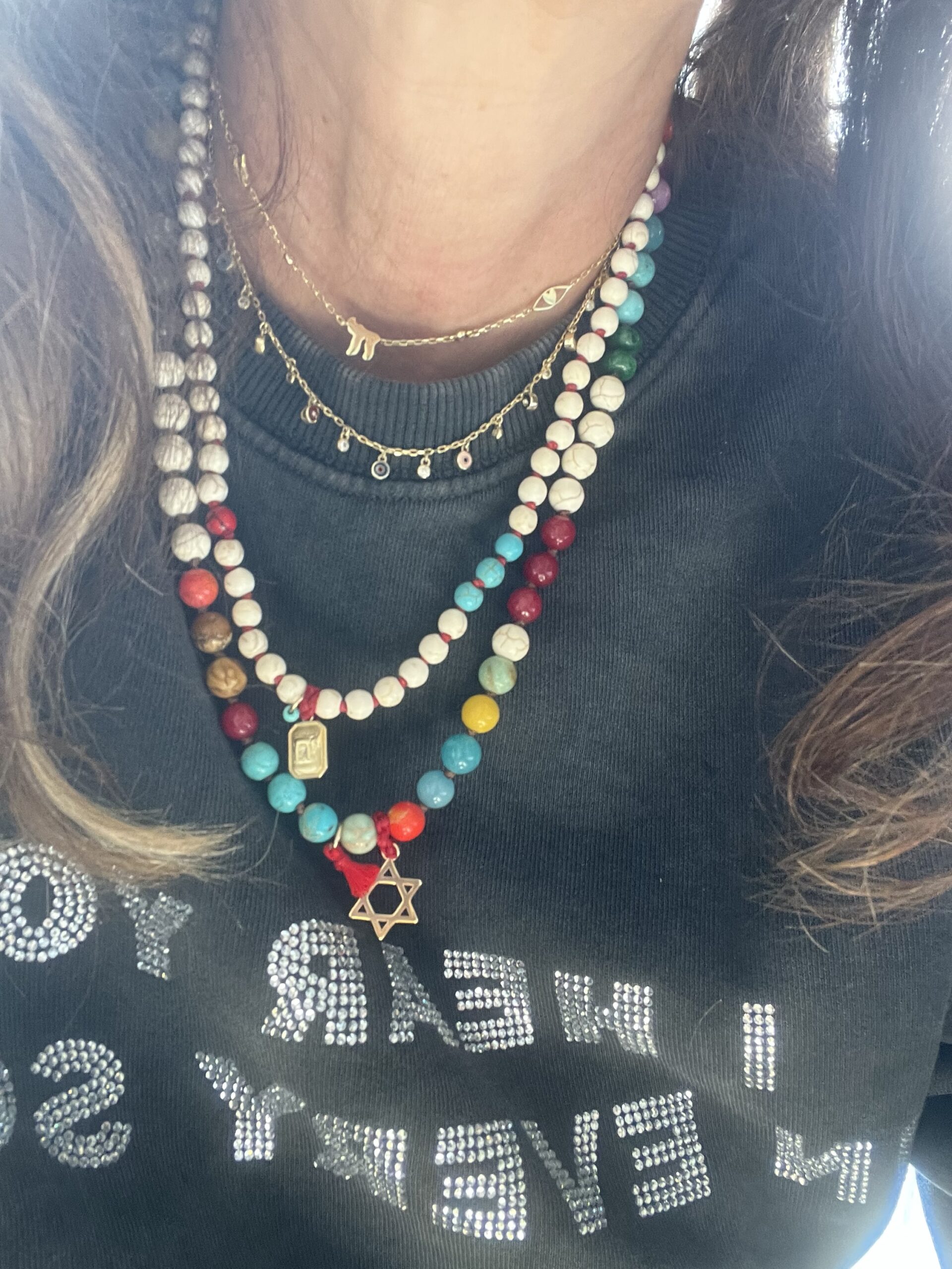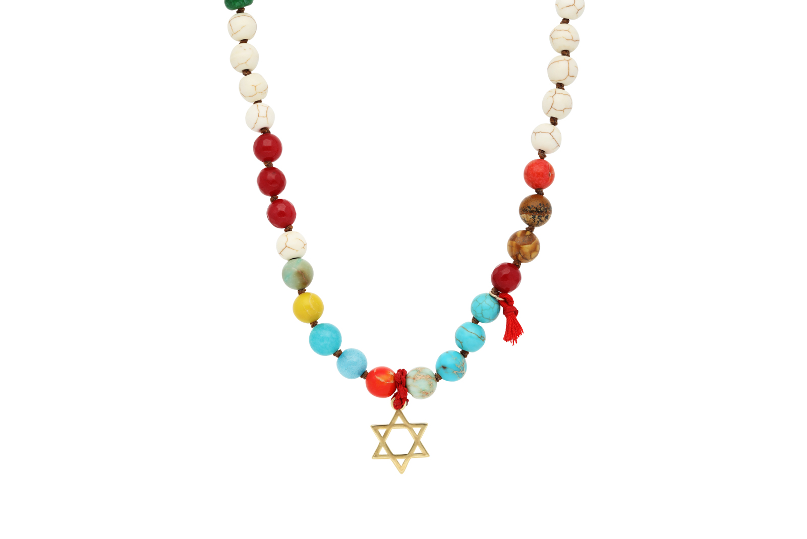 שרשרת אבני חן צבעוניות שזורות בחוט. קשירות מיוחדות בין האבנים. במרכזה תליון מגן דוד בציפוי זהב