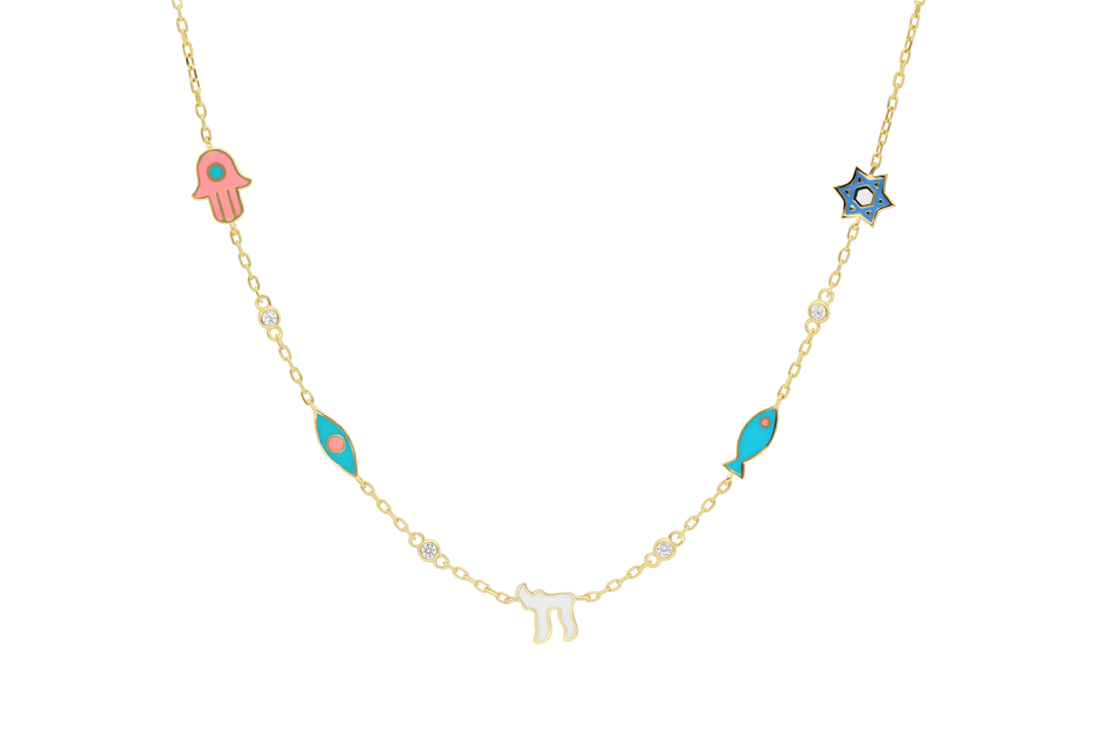 שרשרת עשויה מכסף או כסף מצופה זהב עם אלמנטים מגן דוד, דג, חי, עין וחמסה מצופים אמייל. אורך השרשרת 38 סמ והארכה